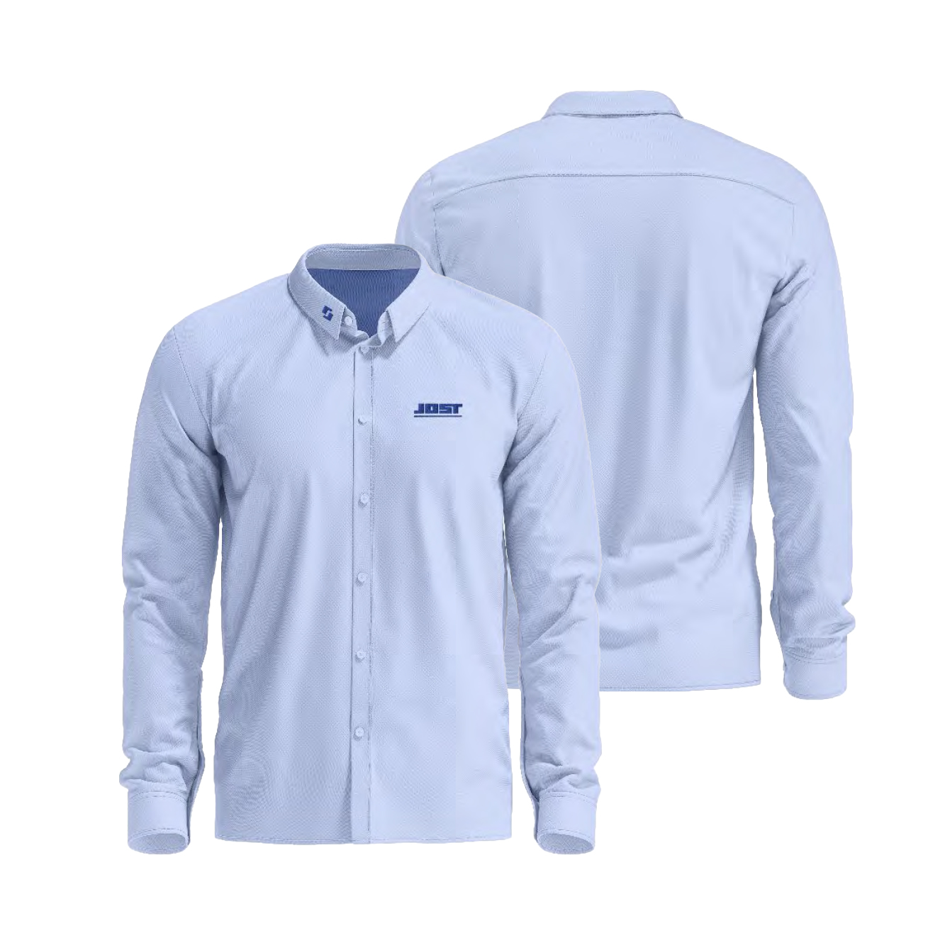 Helles Langarmhemd mit klassischem Schnitt und dezentem blauen JOST-Logo-Stick auf der Brust.